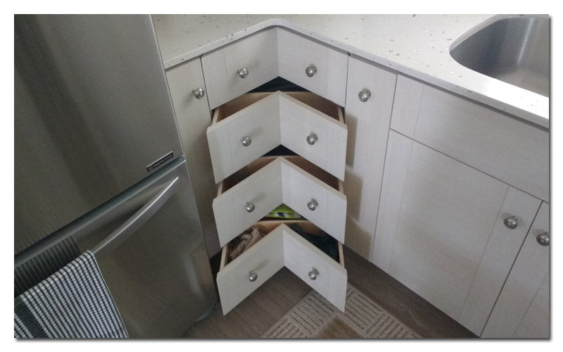 Would you want to try and access a lazy susan in this corner? We wouldn't. The corner drawers add flexible storage that is easy to access. To the left is a small door for storing trays.