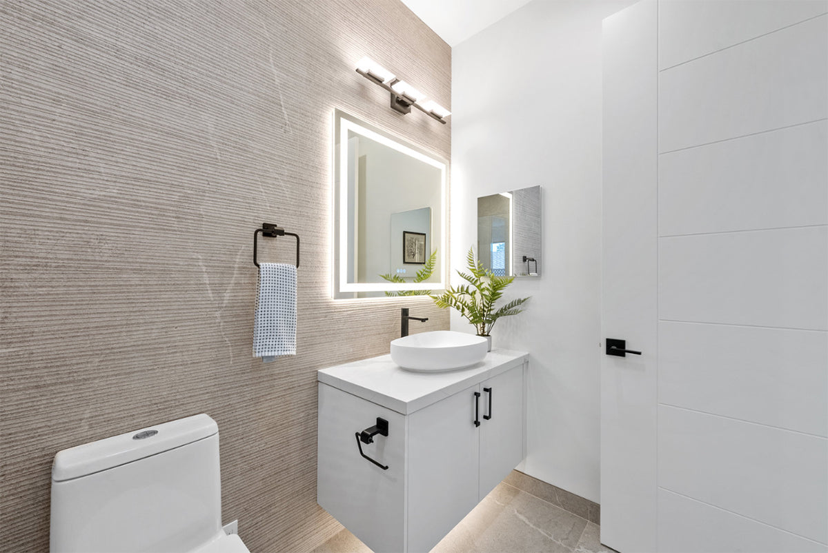 Alvic Supermatte Blanco floating vanity with flushmount LED under cabinet lighting.