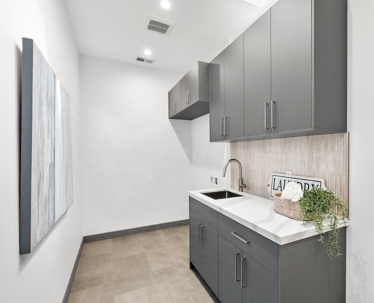 The laundry needs high cabinets, and deep cabinets over the washer and dryer. No need to see the bottoms of the plywood cabinets, under cabinet panels keep it clean.